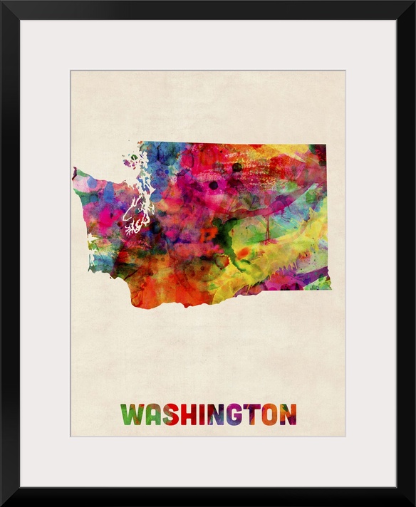 <p>Contemporary piece of artwork of a map of Washington made up of watercolor splashes.</p>