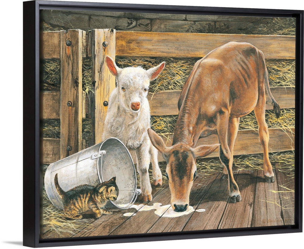 <p>Contemporary painting of farm animals knocking over a pail of milk.</p>