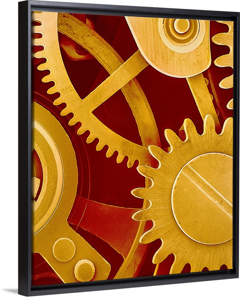 <p>Watch gears. Coloured scanning electron micrograph (SEM) of the internal mechanism of a wristwatch. The crown wheel (lower right) is part of the watch's winding mechanism. The mainspring (far left) is compressed when the watch is wound. The other cogs visible comprise the \motion work\ which drives the hands to display the time on the watch face. Magnification: x8 at 6x7cm size.</p>