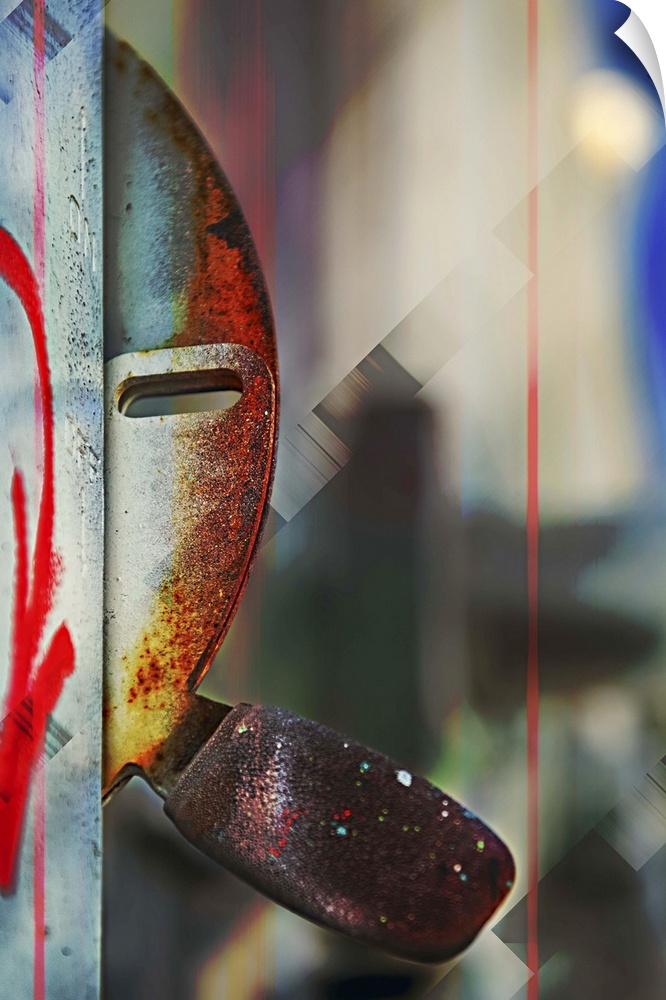 <p>Abstract photograph of rusted metal hardware, resembling a person peering from behind a wall.</p>