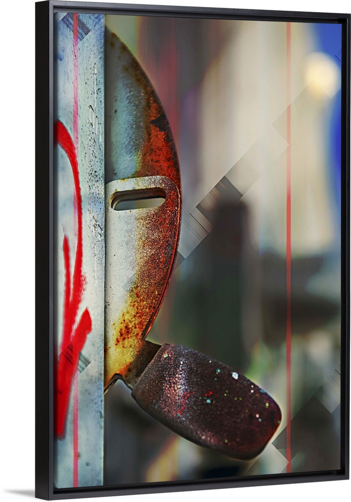 <p>Abstract photograph of rusted metal hardware, resembling a person peering from behind a wall.</p>