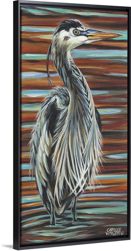<p>Artwork of a Great Blue Heron with fluffed up feathers standing in a shallow pond.</p>