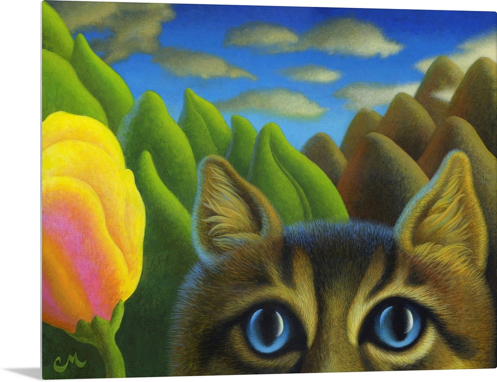 <p>Surrealistic painting of a cat with an abstracted landscape in the background.</p>