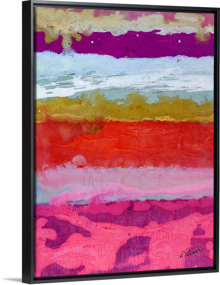 <p>Bright abstract painting with thick horizontal brushstrokes in shades of pink, purple, blue, yellow, green, and white.</p>