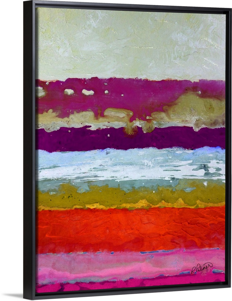 <p>Bright abstract painting with thick horizontal brushstrokes in shades of pink, purple, blue, yellow, green, and white.</p>
