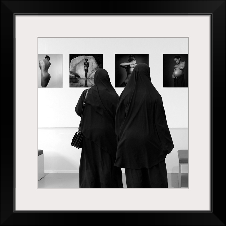 <p>Two women wearing veils looking at fine art in a museum.</p>