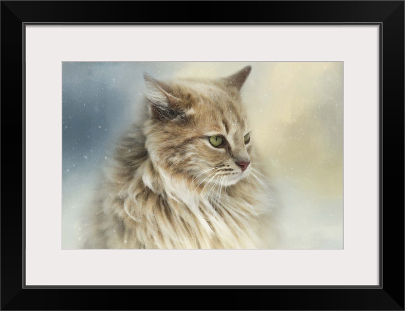 <p>Fine art photo of a long haired cat watching snowflakes.</p>