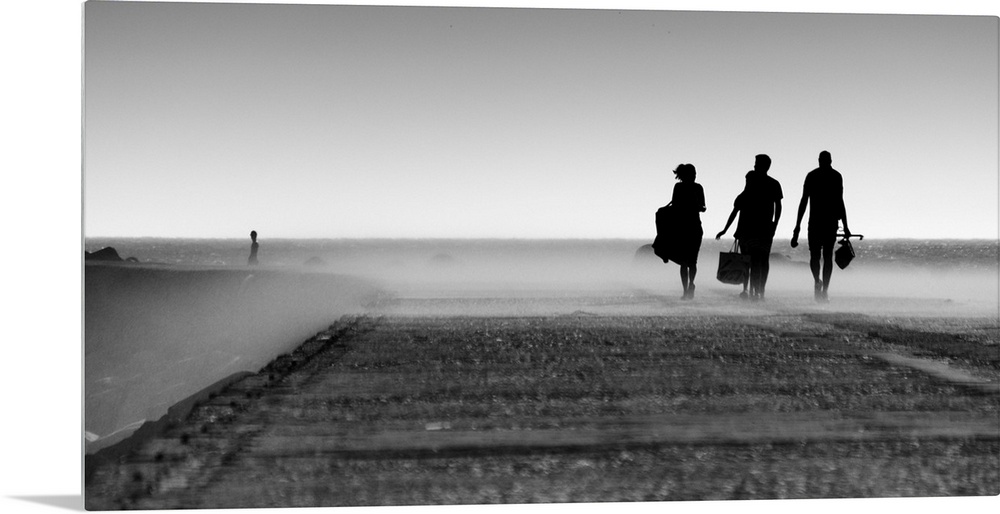 <p>A black and white photograph of three silhouetted figures walking toward a mist.</p>