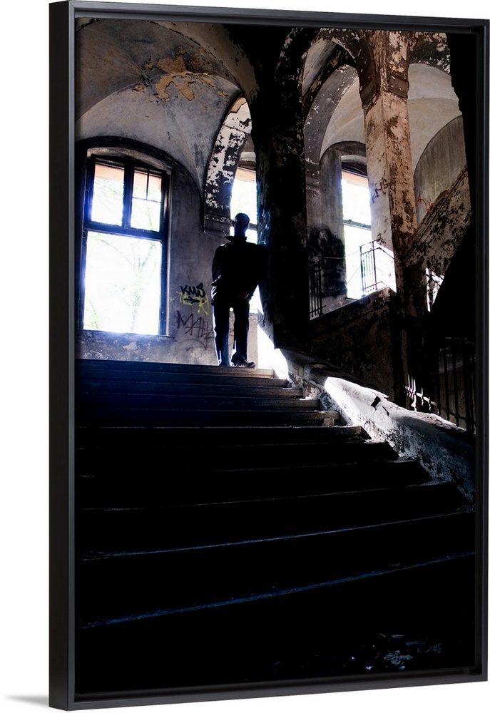<p>Silhouette of a man standing on some old stairs in a large building</p>