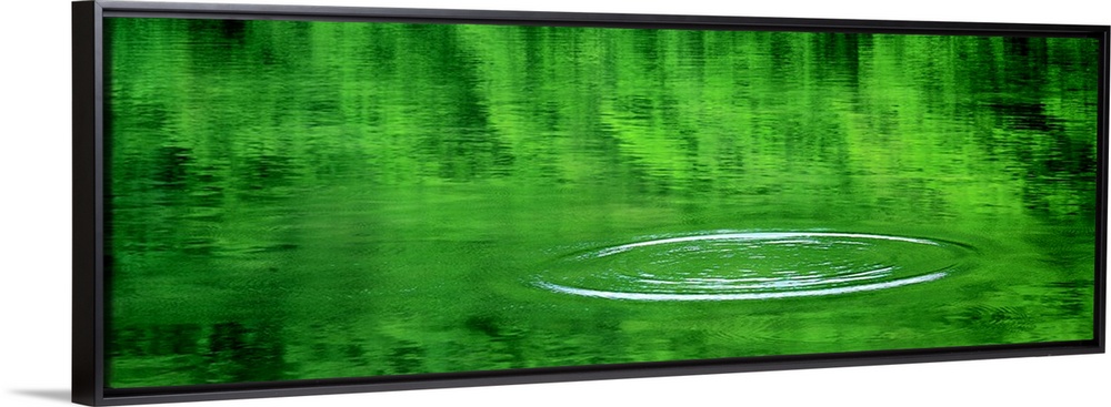 <p>Panoramic photograph on a large wall hanging of still water that reflects the green landscape above it, with only one circular ripple in the foreground.</p>