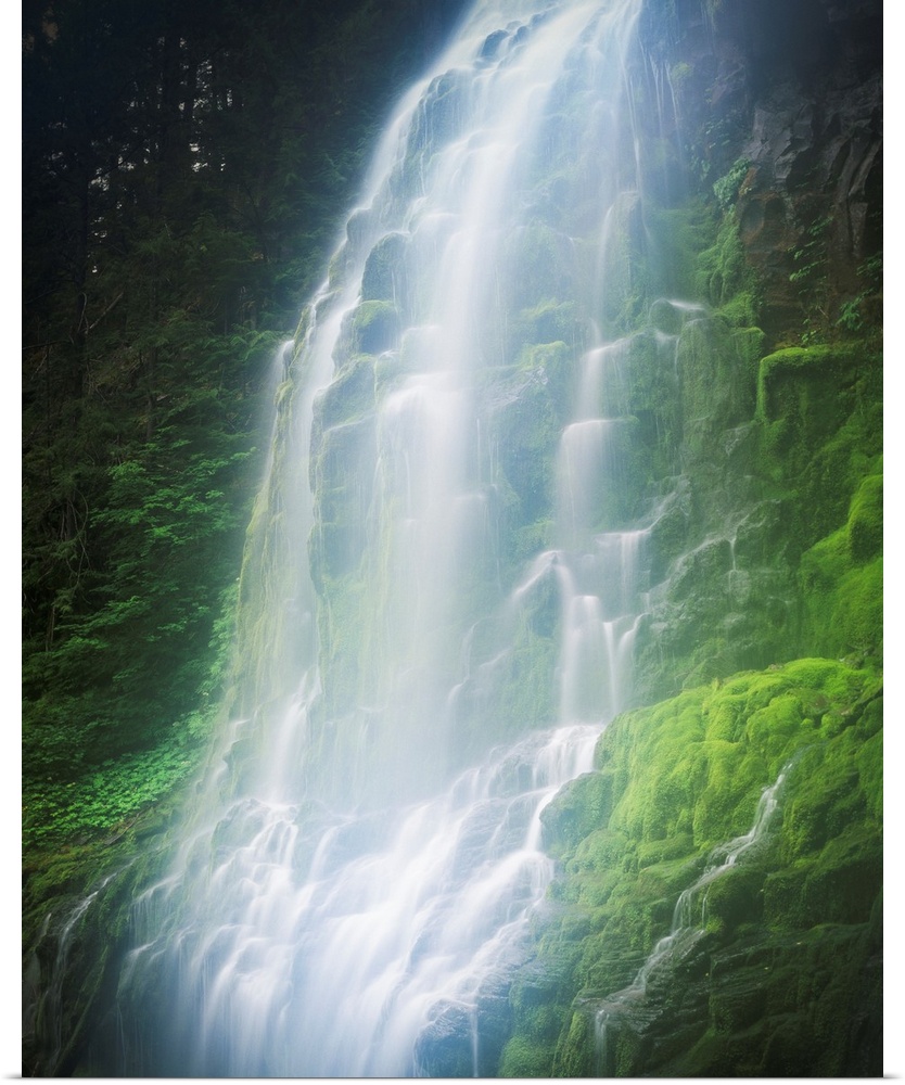 <p>Water cascades down green moss covered rocks. Sisters, Oregon, United States of America.</p>