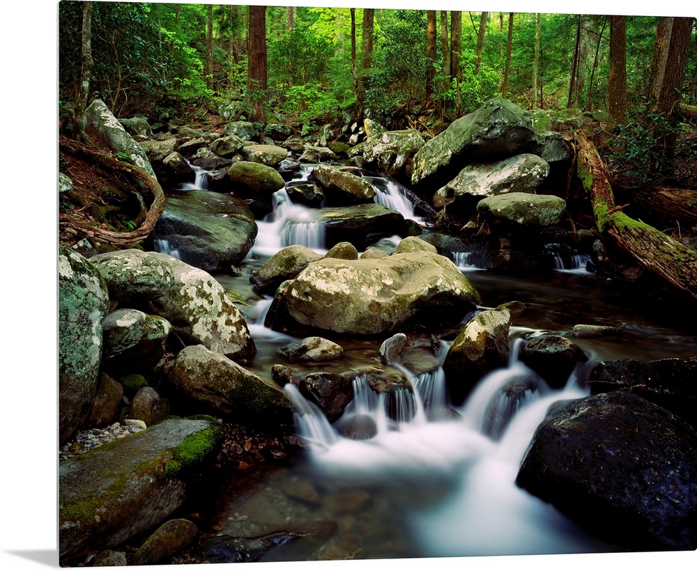 <p>Fresh water pours over and through boulders in a river hidden in a forest.</p>