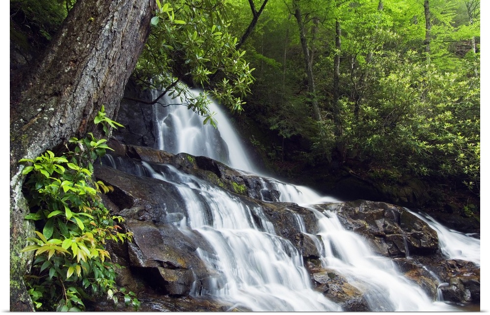 <p>This is a landscape photograph of a waterfall in the forest of a park in the Appalachian Mountains.</p>