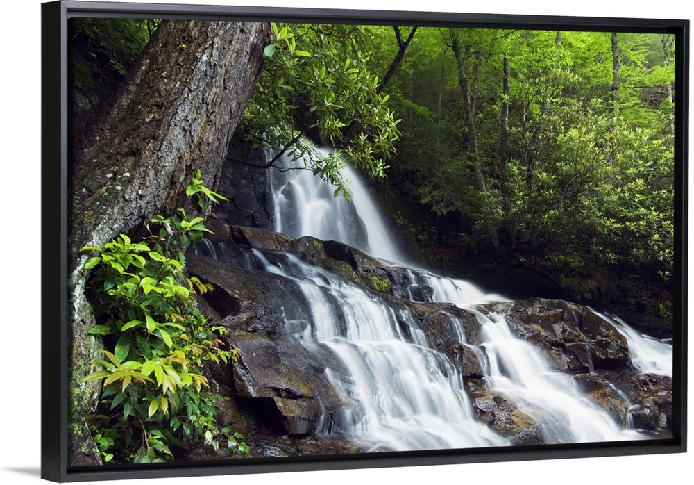 <p>This is a landscape photograph of a waterfall in the forest of a park in the Appalachian Mountains.</p>