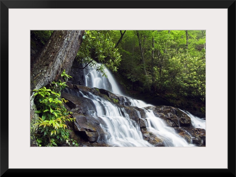 <p>This is a landscape photograph of a waterfall in the forest of a park in the Appalachian Mountains.</p>