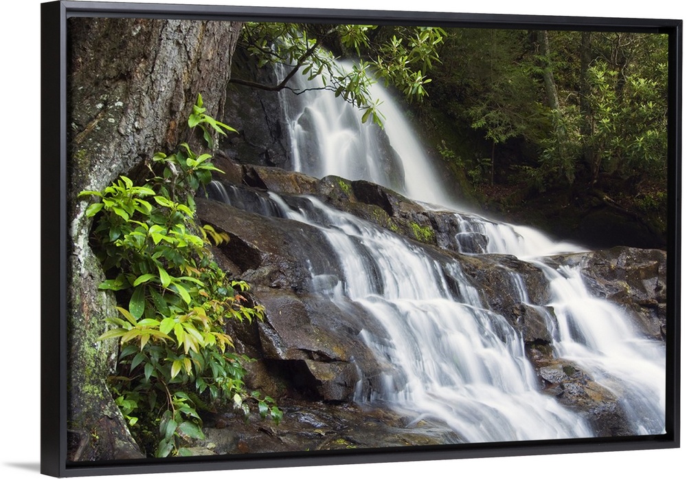 <p>Big photograph displays a waterfall traveling down jagged rock faces within a dense wilderness area in the Southeastern United States.</p>