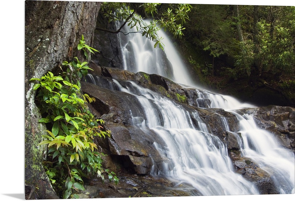<p>Big photograph displays a waterfall traveling down jagged rock faces within a dense wilderness area in the Southeastern United States.</p>