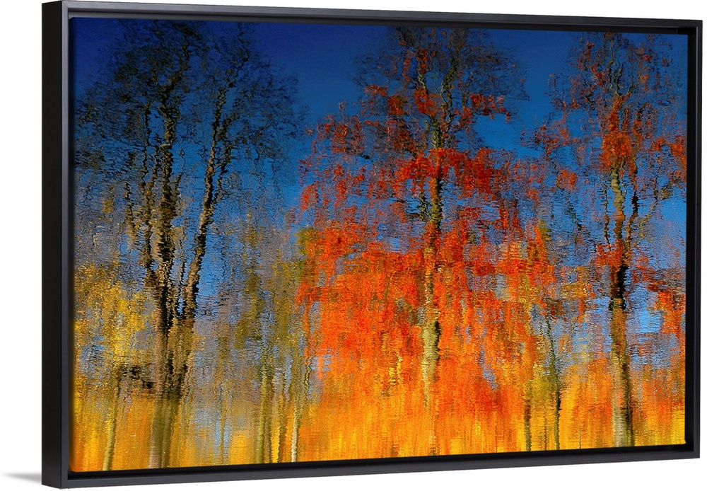<p>The reflection of autumn colored trees is photographed in rippling water so the trees appear jagged.</p>