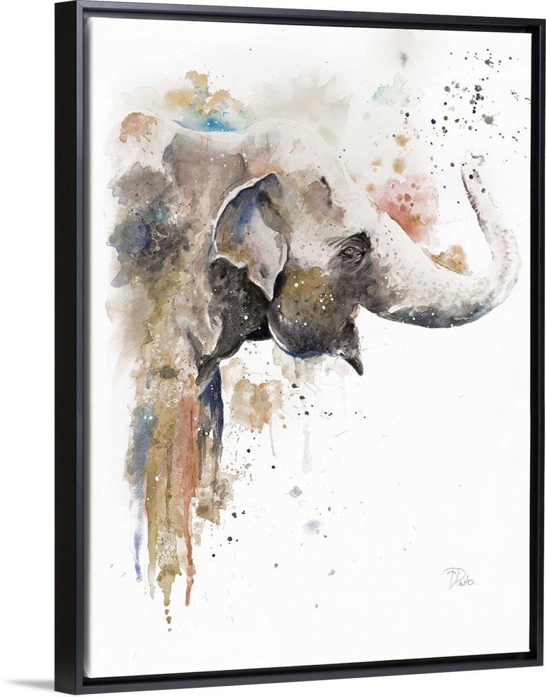 <p>Watercolor painting of an elephant embellished with gold and paint splatters.</p>
