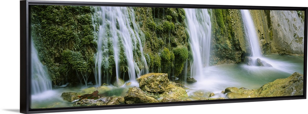 <p>Panoramic photograph taken of several waterfalls cascading over foliage and crashing onto rocks.</p>