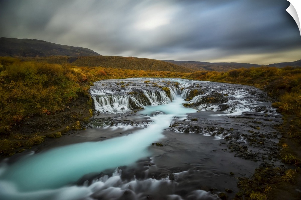 <p>Long Exposure Of Water Flowing Over Rock In A Stream And Dark Clouds In The Sky, Bruarfoss, Iceland</p>