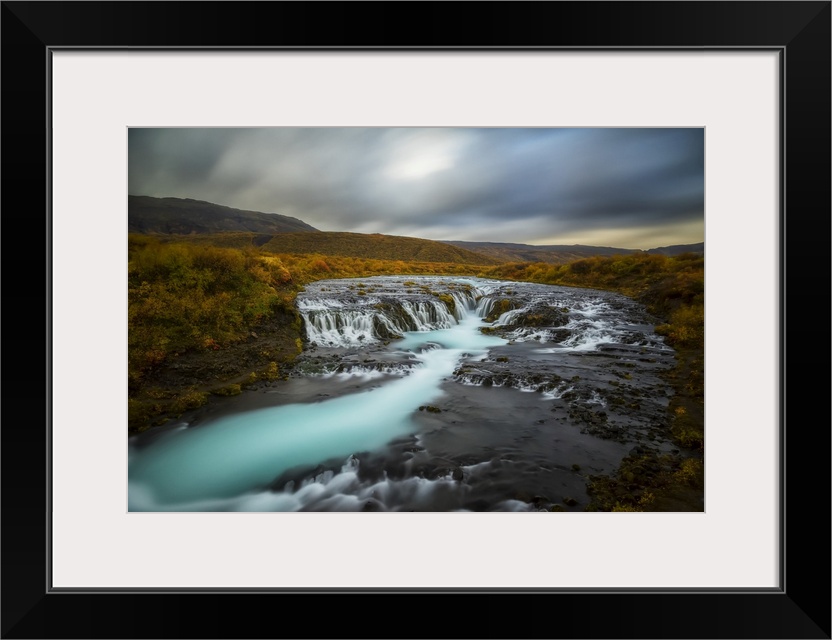 <p>Long Exposure Of Water Flowing Over Rock In A Stream And Dark Clouds In The Sky, Bruarfoss, Iceland</p>