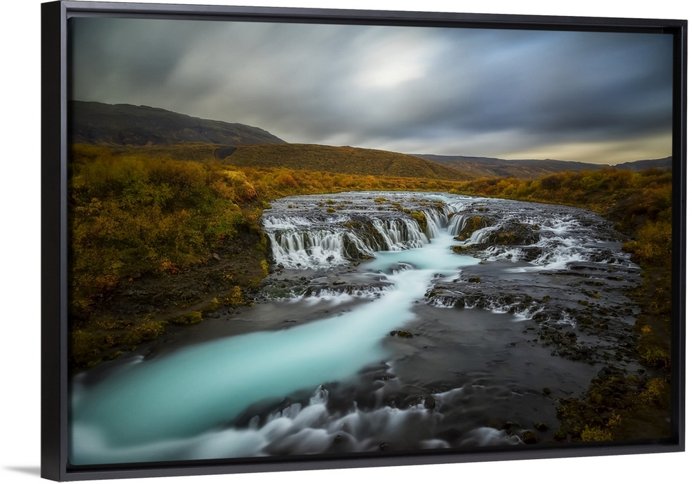 <p>Long Exposure Of Water Flowing Over Rock In A Stream And Dark Clouds In The Sky, Bruarfoss, Iceland</p>