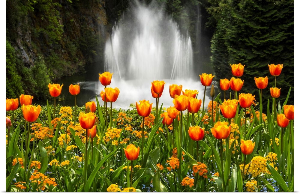 <p>Water Fountain And Tulips At Butchart Gardens; Victoria, British Columbia, Canada</p>