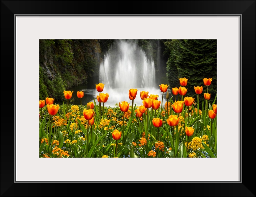 <p>Water Fountain And Tulips At Butchart Gardens; Victoria, British Columbia, Canada</p>