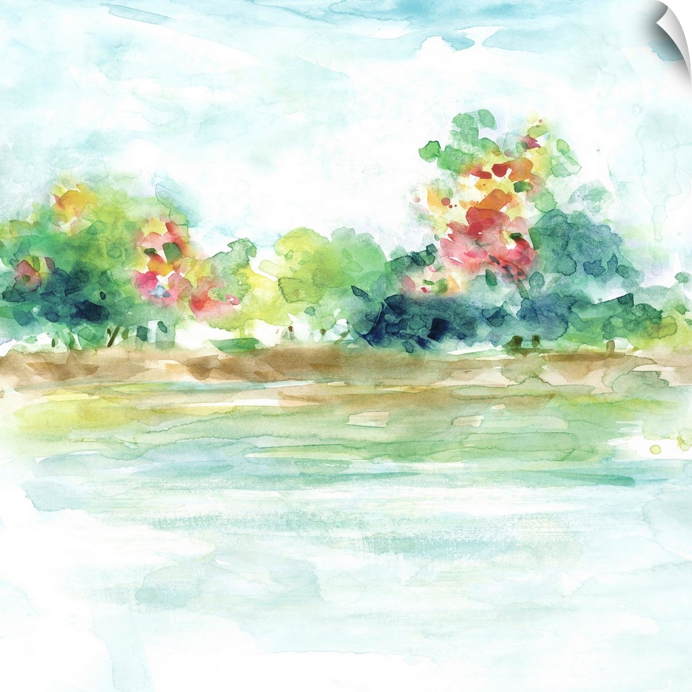 <p>Watercolor landscape with colorful florals and green trees on a square background.</p>