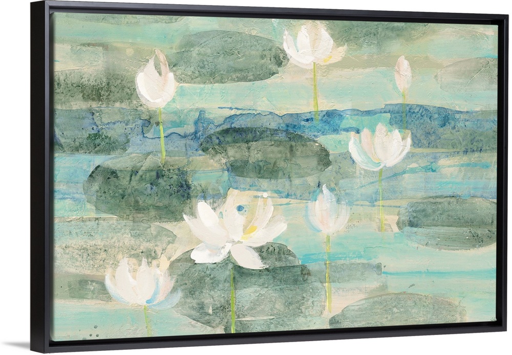 <p>Large abstract painting of white lilies and green lily pads floating in water made with shades of blue.</p>