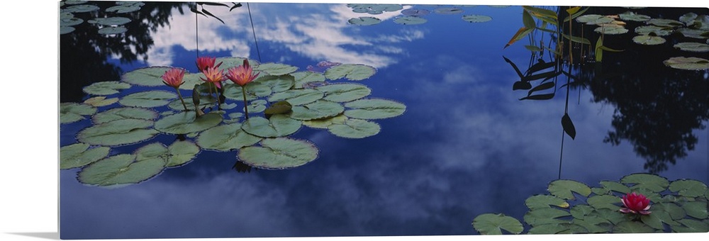 <p>This was art is a panoramic shapes photograph that is a close up of lily pads floating on water reflecting the clouds in the sky.</p>