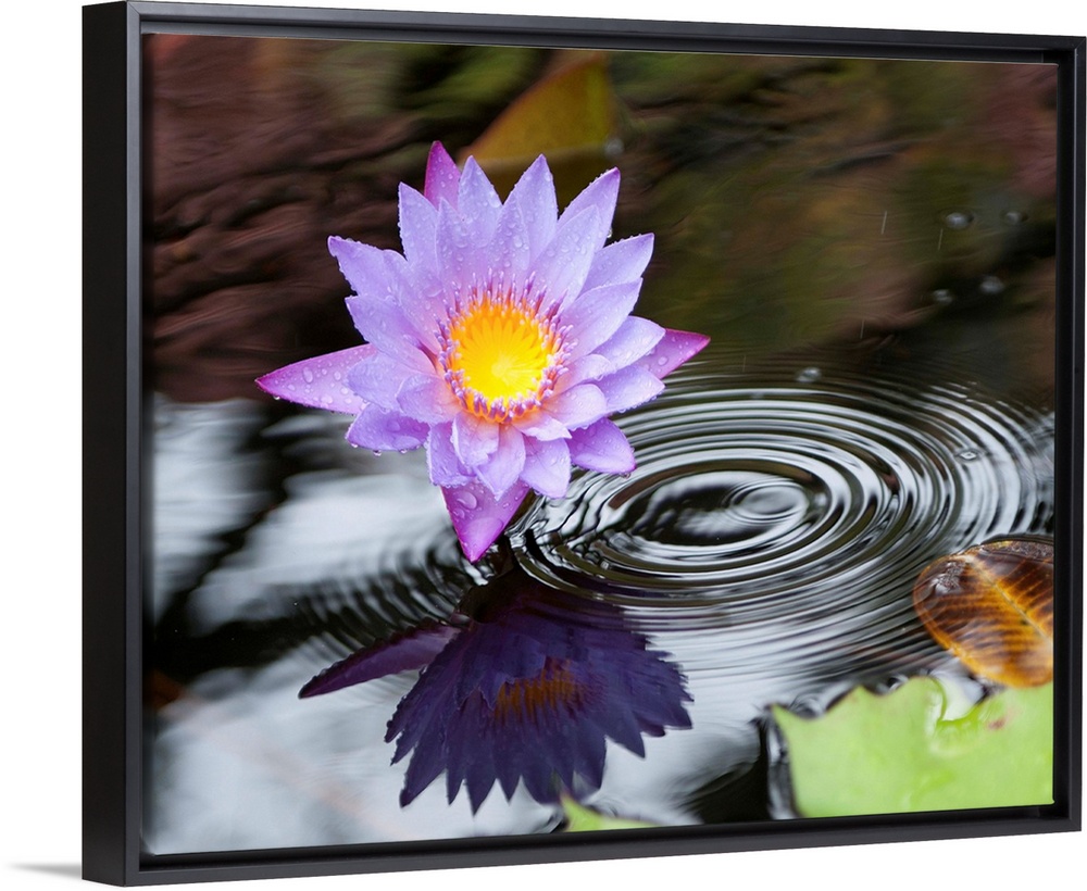 <p>Purple lotus flower in a pond with ripples from falling rain.</p>