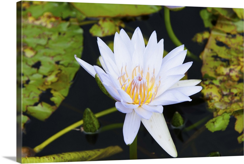 Water lily with lily pads in a pond, Isola Madre, Stresa, Lake Maggiore, Piedmont, Italy