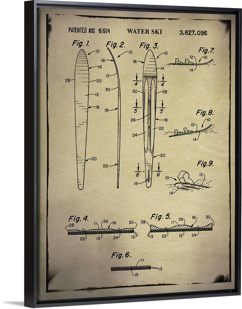 <p>Blueprint diagram depicting the parts of a water ski.</p>