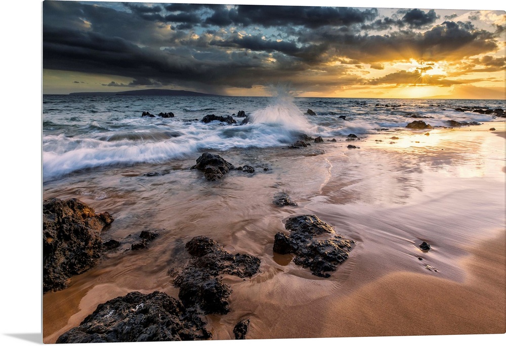 <p>Water splashing on the beach with a golden sunset over the ocean; Hawaii, United States of America</p>