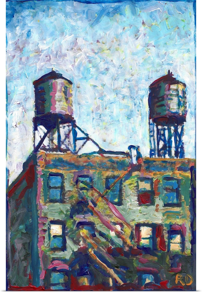 <p>Water Towers in New York by RD Riccoboni, impressionist style painting of NYC in green, blue, red, orange, white and yellows. Architectural and Geometric shapes brushwork and brushstrokes.</p>