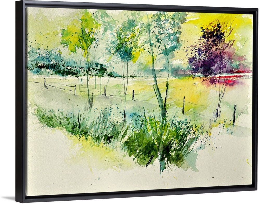 <p>A horizontal watercolor landscape of a fenced in filed with bright speckled colors of green, yellow and red.</p>