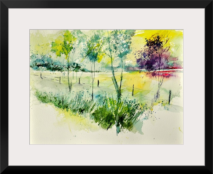 <p>A horizontal watercolor landscape of a fenced in filed with bright speckled colors of green, yellow and red.</p>