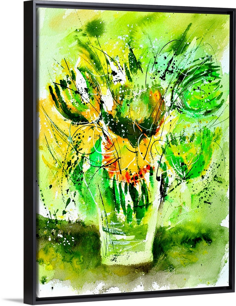 <p>A vertical abstract watercolor of a vase of flowers with vivid colors of green and yellow.</p>