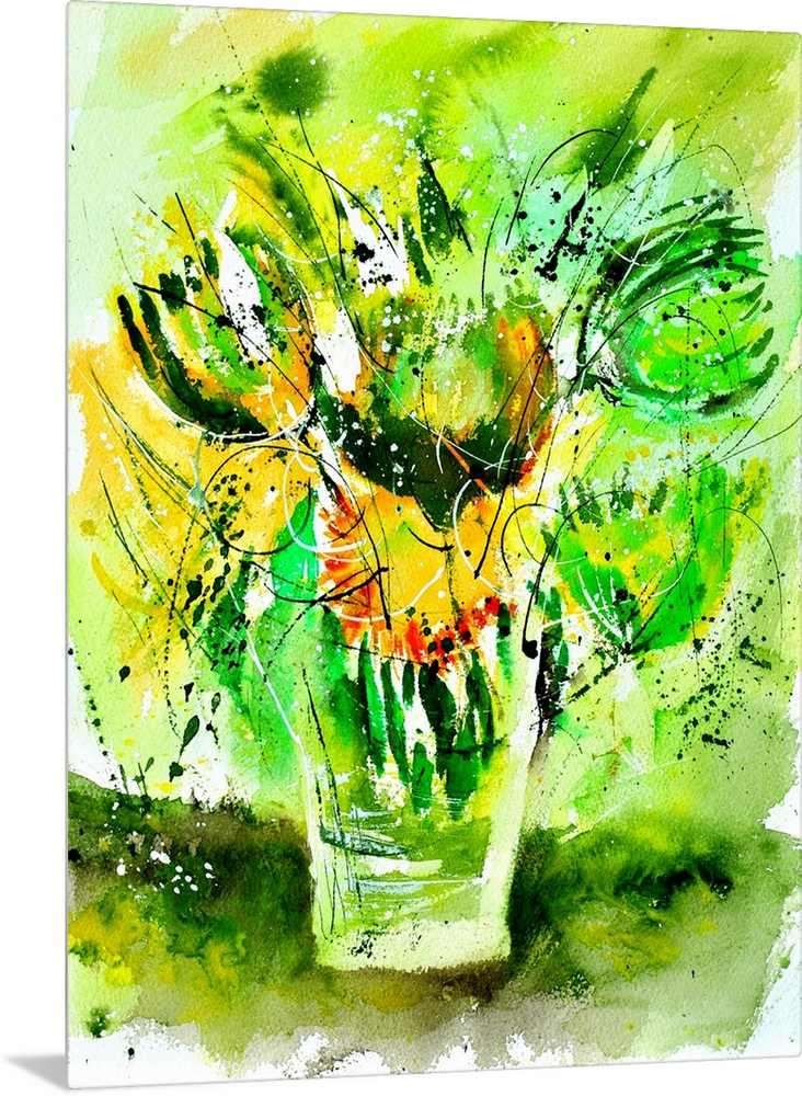 <p>A vertical abstract watercolor of a vase of flowers with vivid colors of green and yellow.</p>