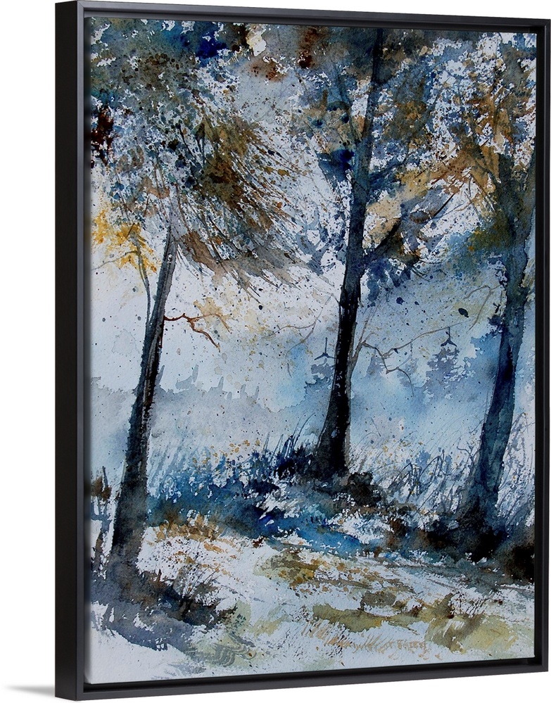 <p>A vertical watercolor landscape of a forest with muted speckled colors of brown and blue.</p>