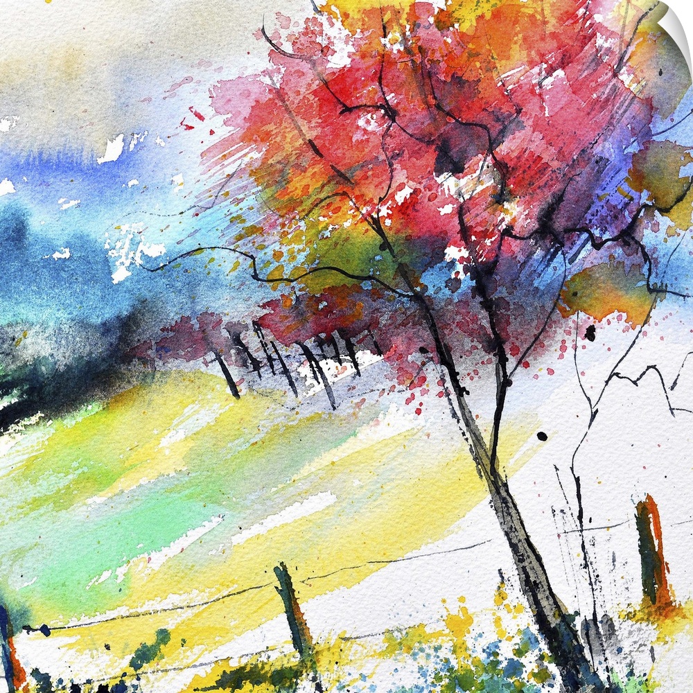 <p>A square watercolor landscape of a tree in autumn colors.</p>