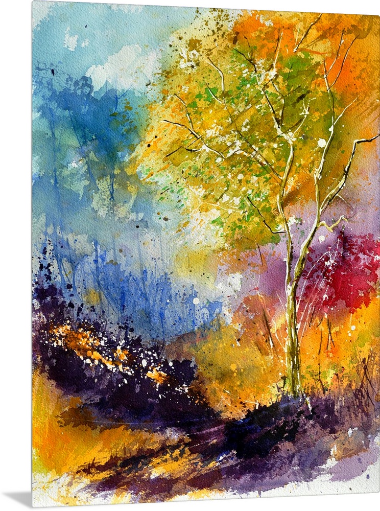 <p>Vertical watercolor painting of vibrant colors in shades of blue, orange and purple.</p>