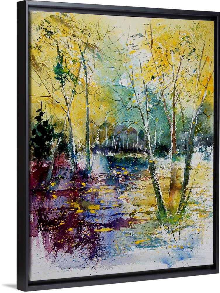 <p>Watercolor painting of a pond in a forest done in vibrant colors of yellow, green and blue.</p>