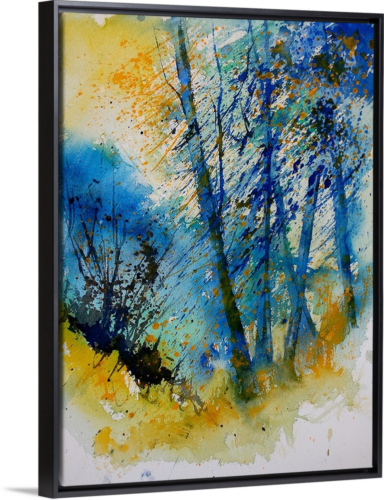 <p>A vertical watercolor landscape of trees in bright colors of yellow and blue.</p>