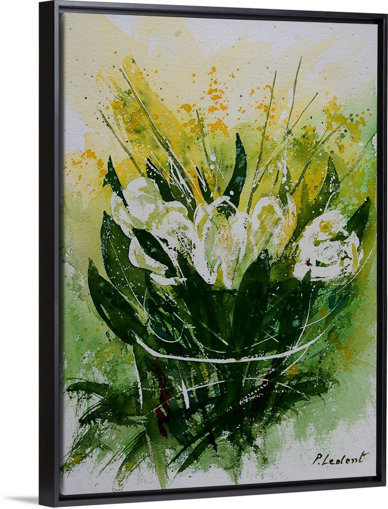 <p>Vertical watercolor painting of a bouquet of white tulips against a green, yellow and white backdrop.</p>