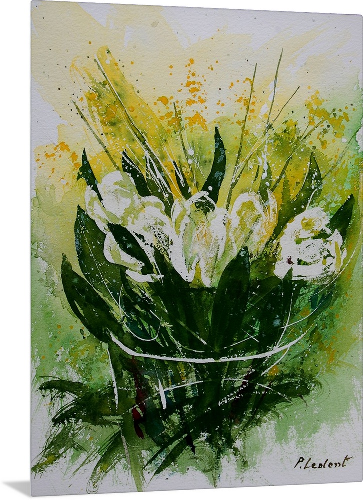 <p>Vertical watercolor painting of a bouquet of white tulips against a green, yellow and white backdrop.</p>
