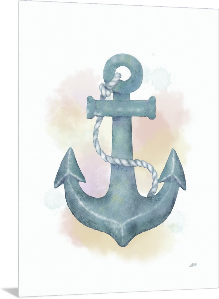 <p>Nautical watercolor painting of an anchor in blue tones.</p>