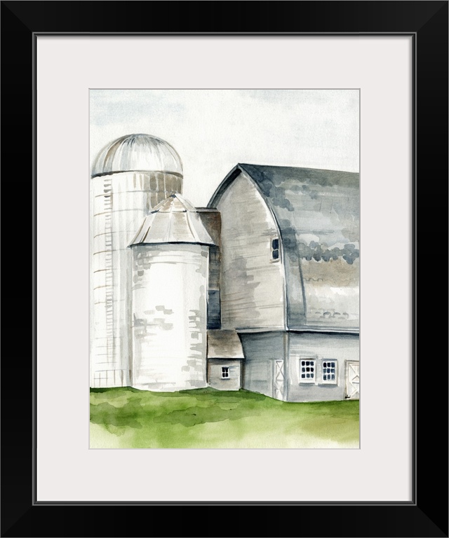 <p>This watercolor painting features a serene barn with a silo.</p>